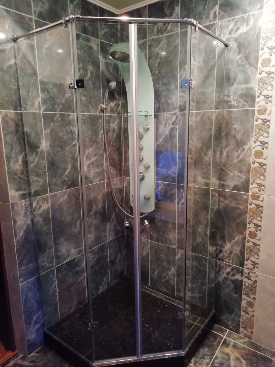Двухстворчатая трапециевидная душевая кабинка под заказ из закаленного стекла толщиной 8мм с двумя маятниковыми стеклянными дверцами и двумя фиксированными панелями – достойное решение для просторных ванных комнат. В такой конструкции стекла расположены симметрично под углом больше чем 90 градусов, в остальном, изделие соответствует обычному душевому уголку, но грамотно подобранная фурнитура, вид и цвет стеклянных панелей и (или) их комбинация, позволяют выглядеть такой душевой кабине, как произведение искусства.
