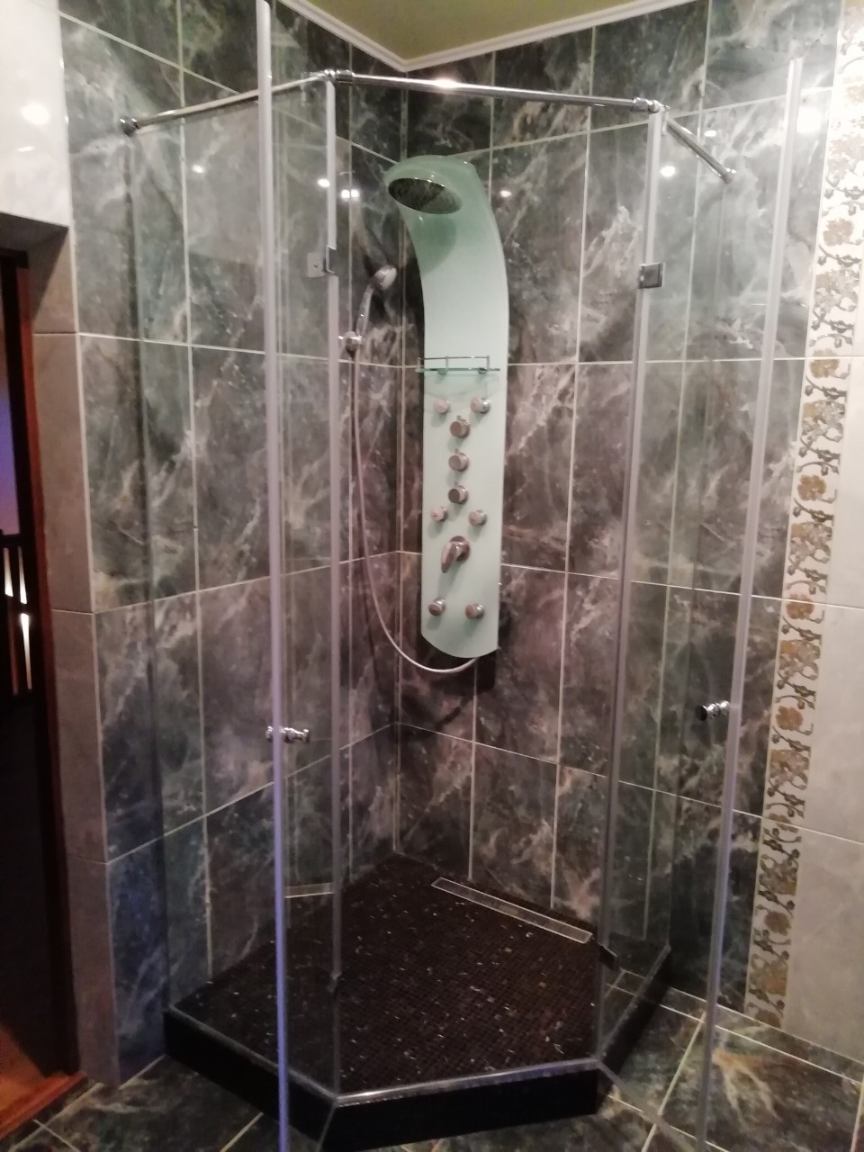 Трапециевидная стеклянная душевая кабина комплектуется стильной и высококачественной фурнитурой из латуни и нержавеющей стали, которая отлично гармонирует с керамической плиткой и другими видами современной отделки. Широкий ассортимент дизайнов и цветов: хром, матовый хром, бронза, с напылением под золото, черный и пр. удовлетворит любой самый взыскательный вкус. Исполнение заказа возможно не только из обычного стекла, но и осветленного, тонированного, матового, в том числе с применением художественной пескоструйной обработки либо гравировки, по желанию Заказчика.
