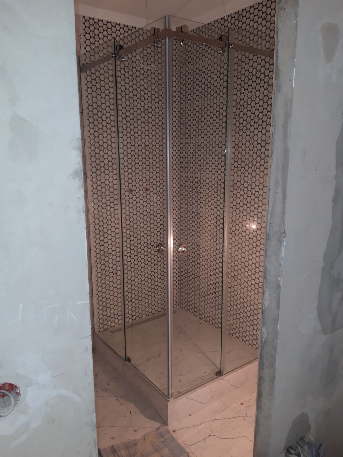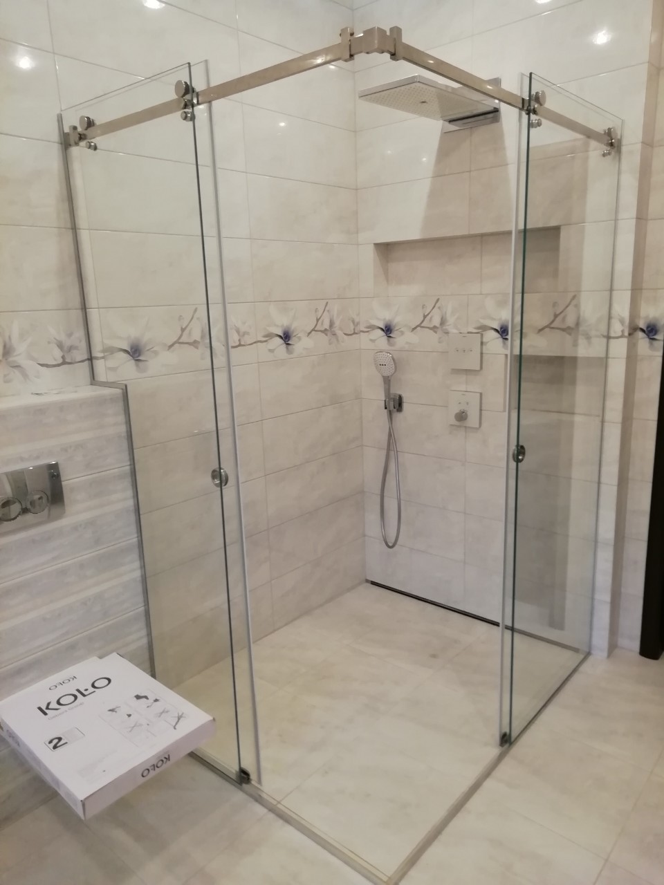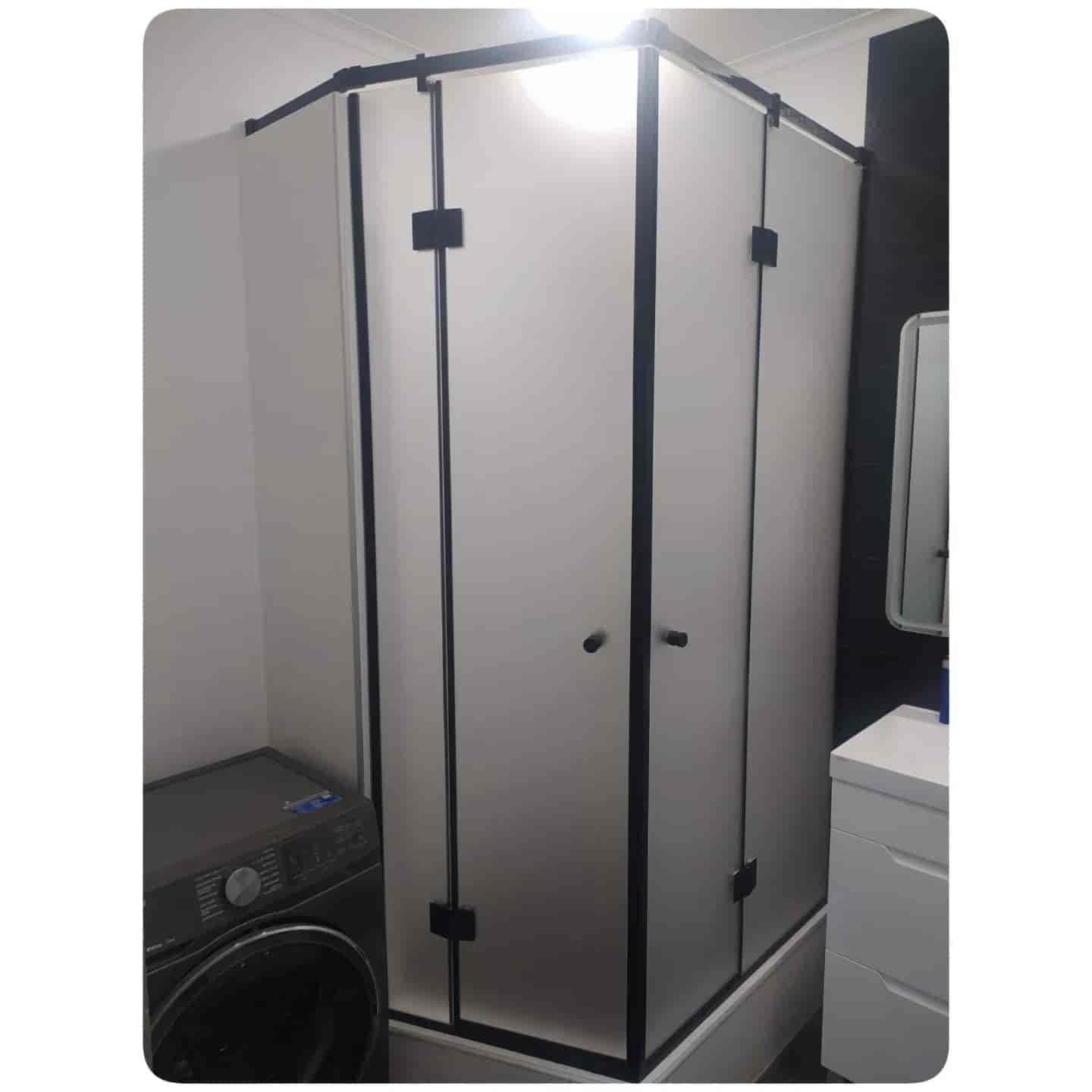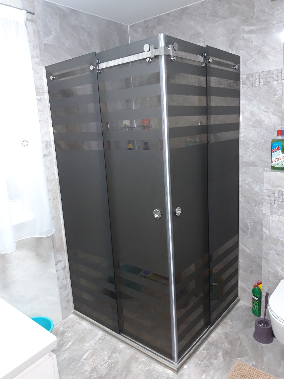 Двухстворчатая угловая душевая кабина из закаленного стекла толщиной 8мм изготавливается на заказ по индивидуальным размерам помещения. Такого типа душевая кабина, которую обычно называют душевой уголок, не портится от воды и испарений, не поддается коррозии, отличается химической стойкостью и благодаря отражательной способности стекла добавляет интерьеру ванной комнаты легкости и воздушности.