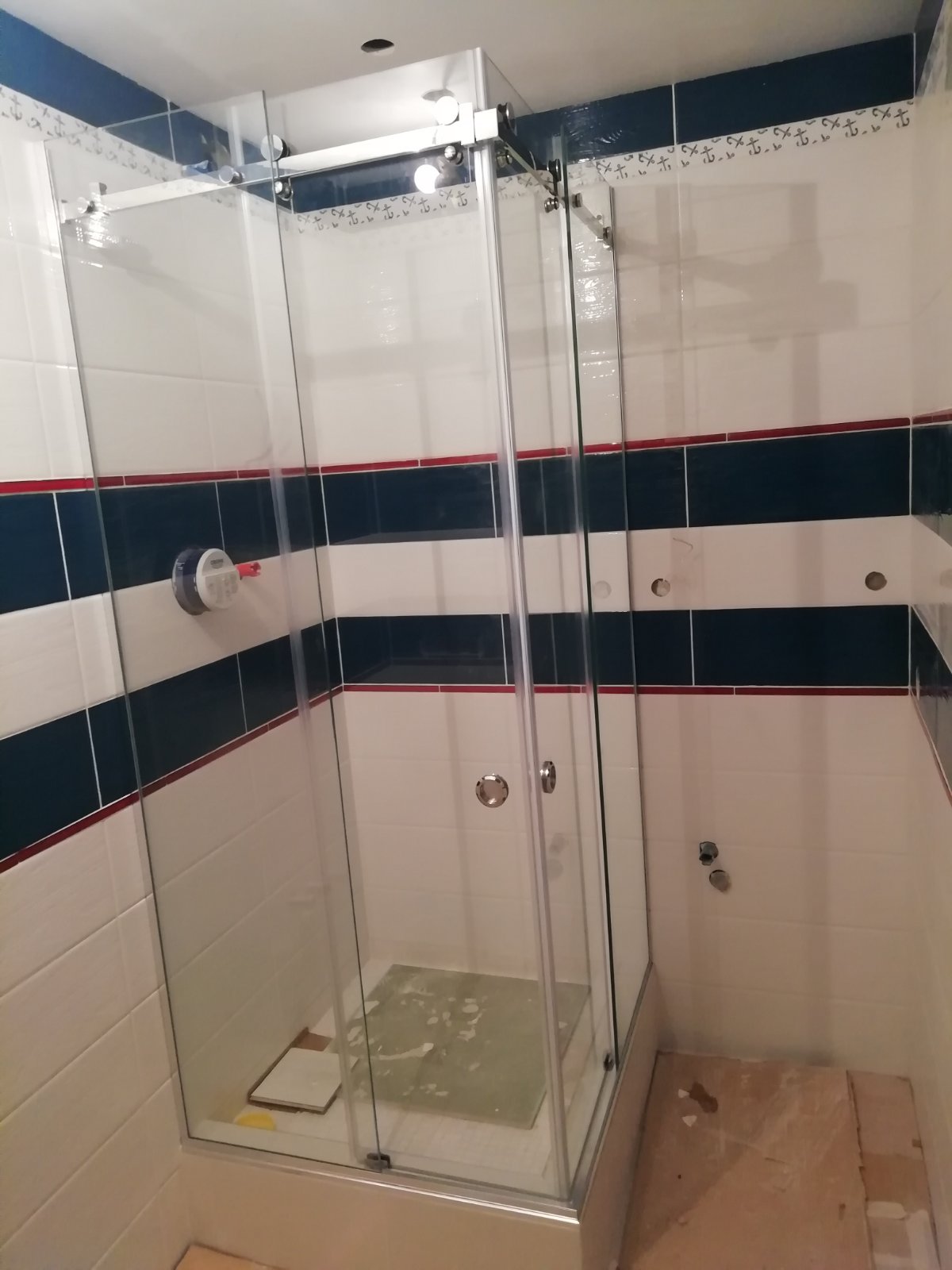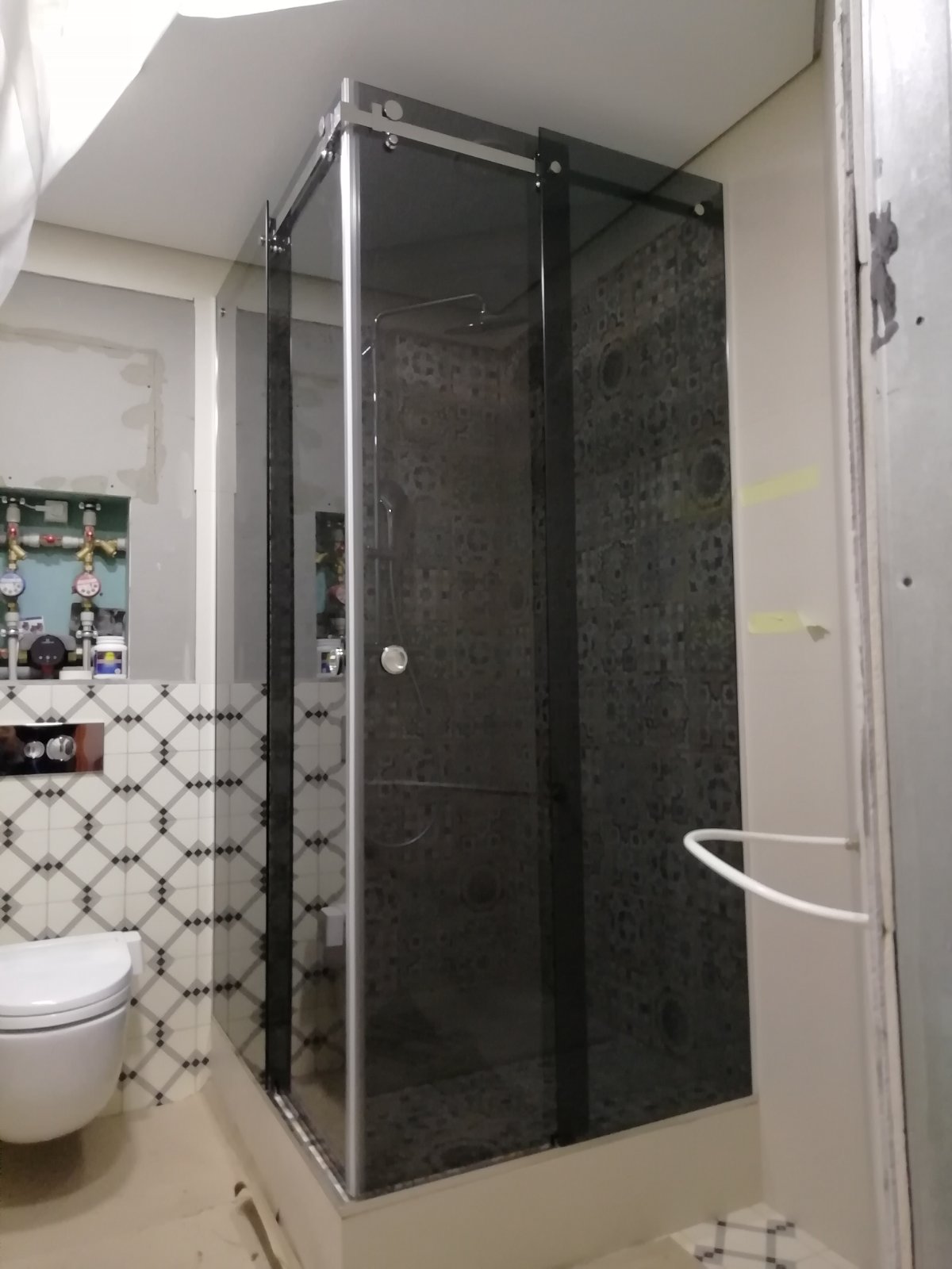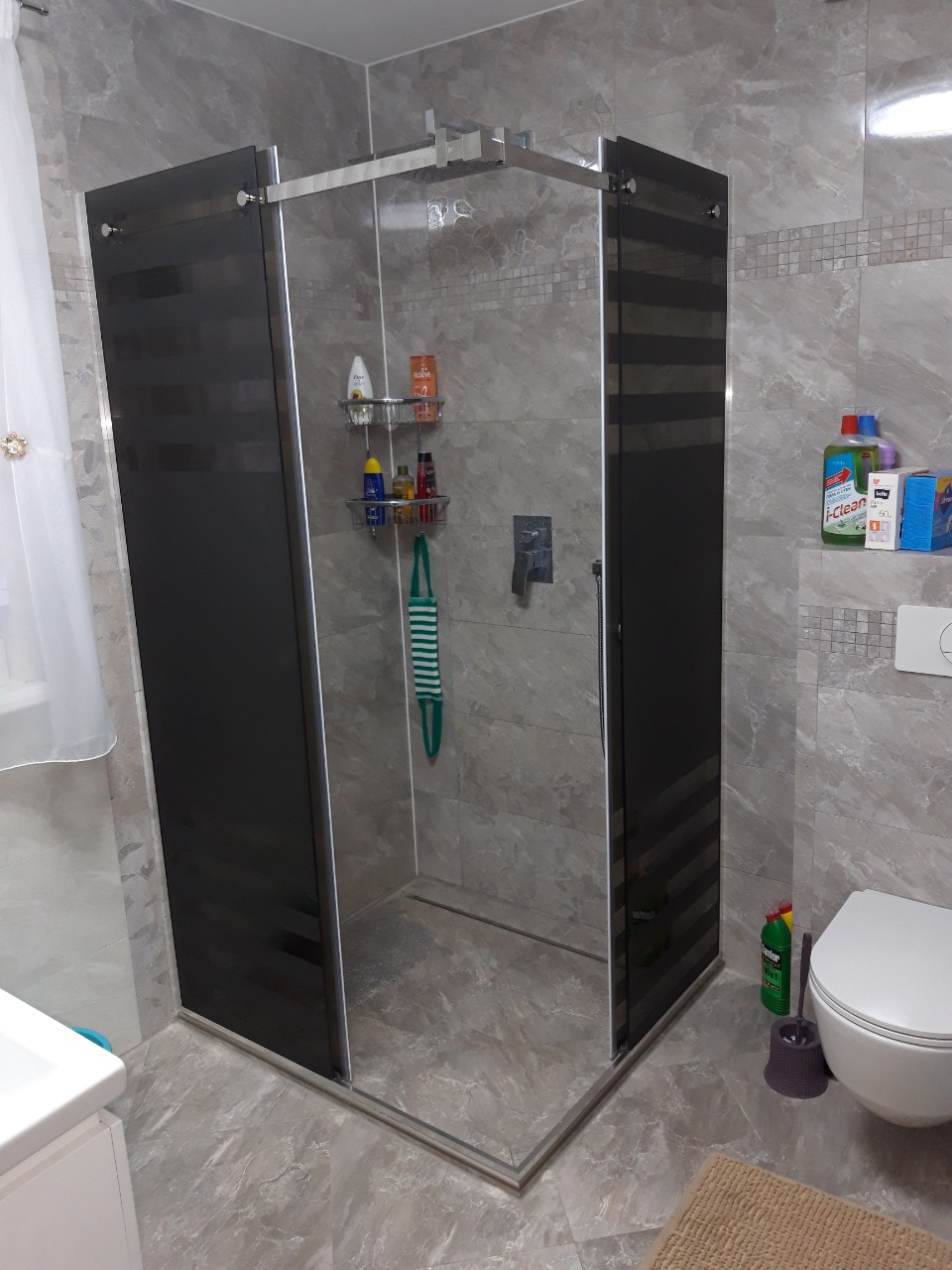 Двухстворчатая угловая душевая кабина из закаленного стекла толщиной 8мм изготавливается на заказ по индивидуальным размерам помещения. Такого типа душевая кабина, которую обычно называют душевой уголок, не портится от воды и испарений, не поддается коррозии, отличается химической стойкостью и благодаря отражательной способности стекла добавляет интерьеру ванной комнаты легкости и воздушности.