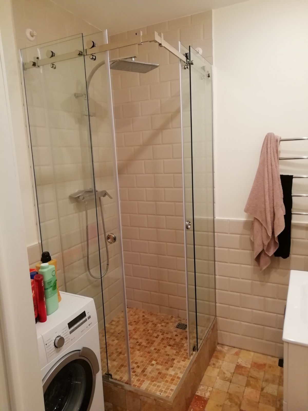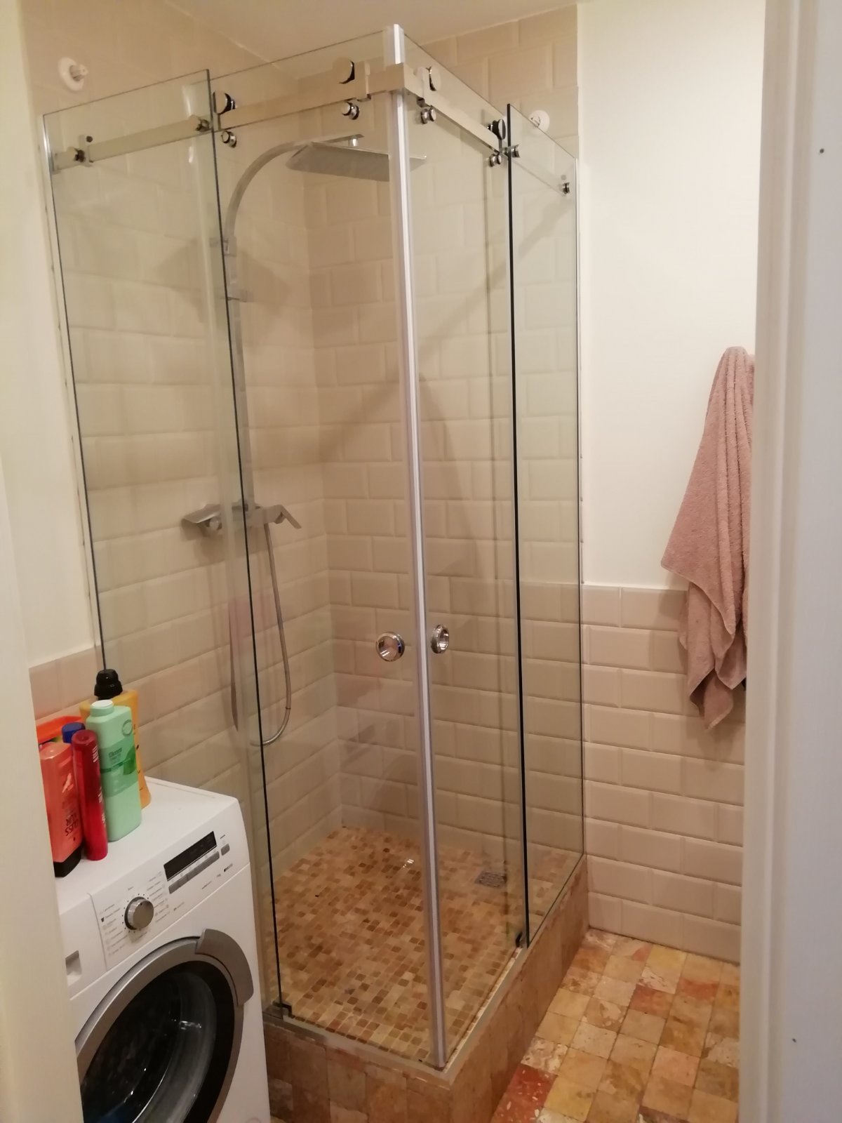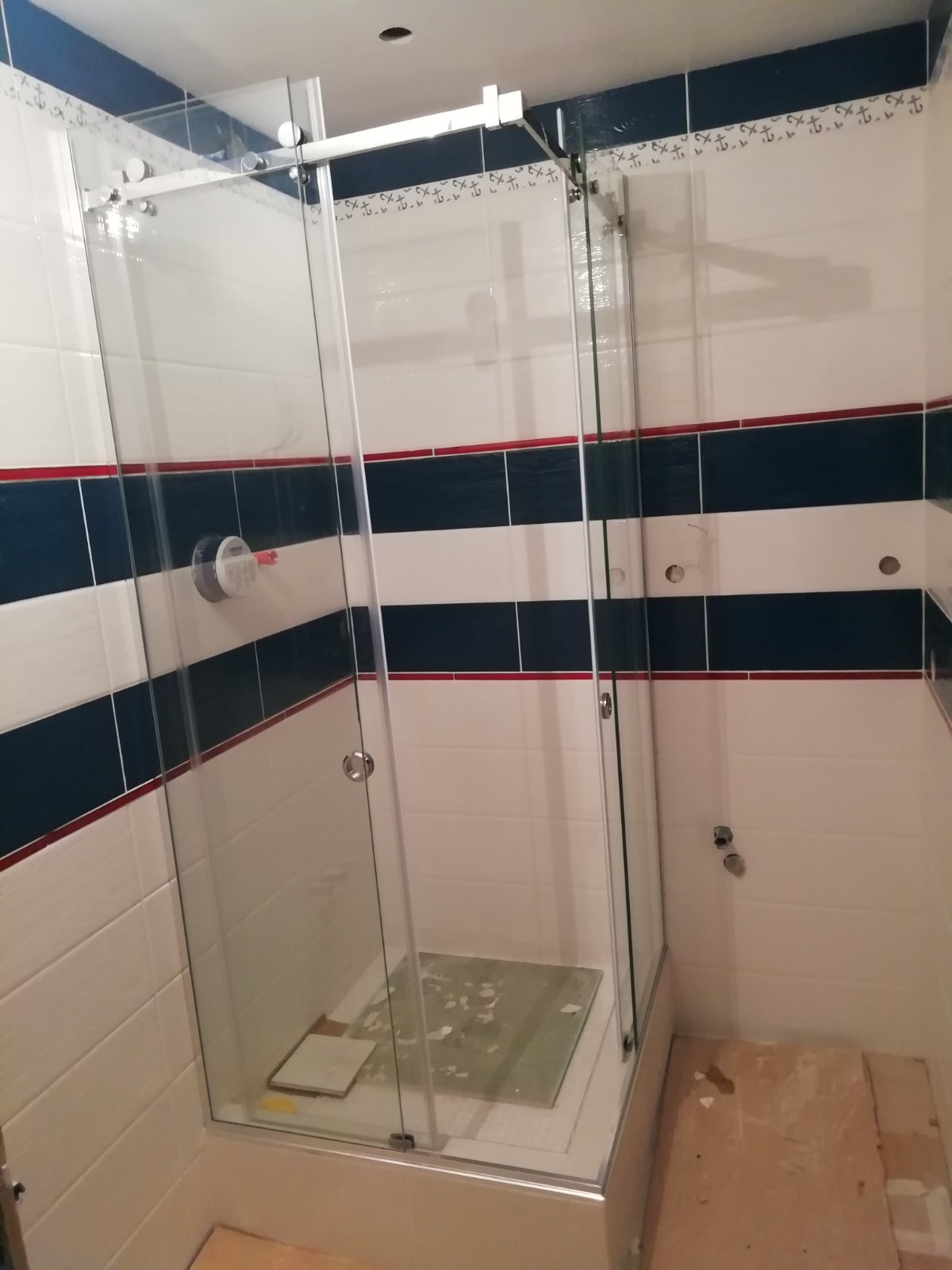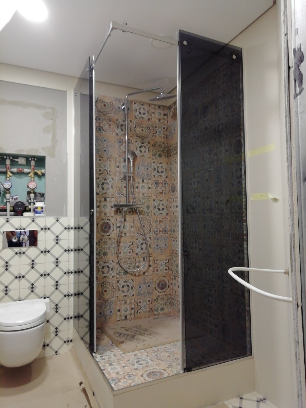 Двухстворчатая угловая душевая кабина из закаленного стекла толщиной 8мм изготавливается на заказ по индивидуальным размерам помещения. Такого типа душевая кабина, которую обычно называют душевой уголок, не портится от воды и испарений, не поддается коррозии, отличается химической стойкостью и благодаря отражательной способности стекла добавляет интерьеру ванной комнаты легкости и воздушности.