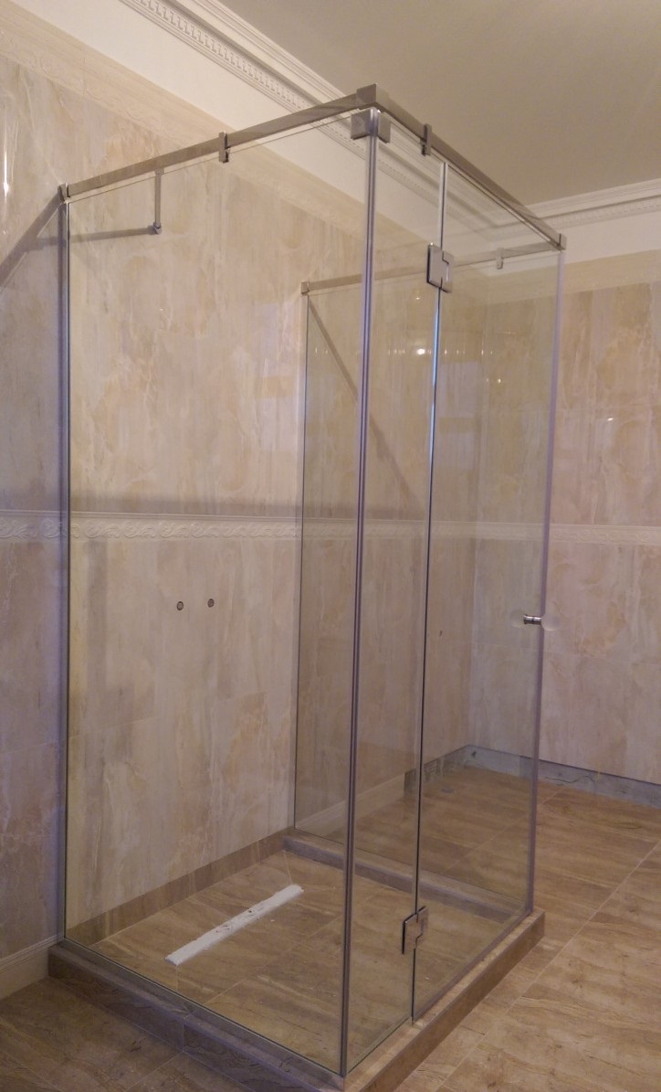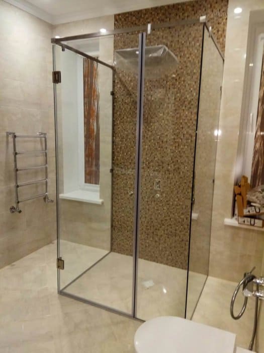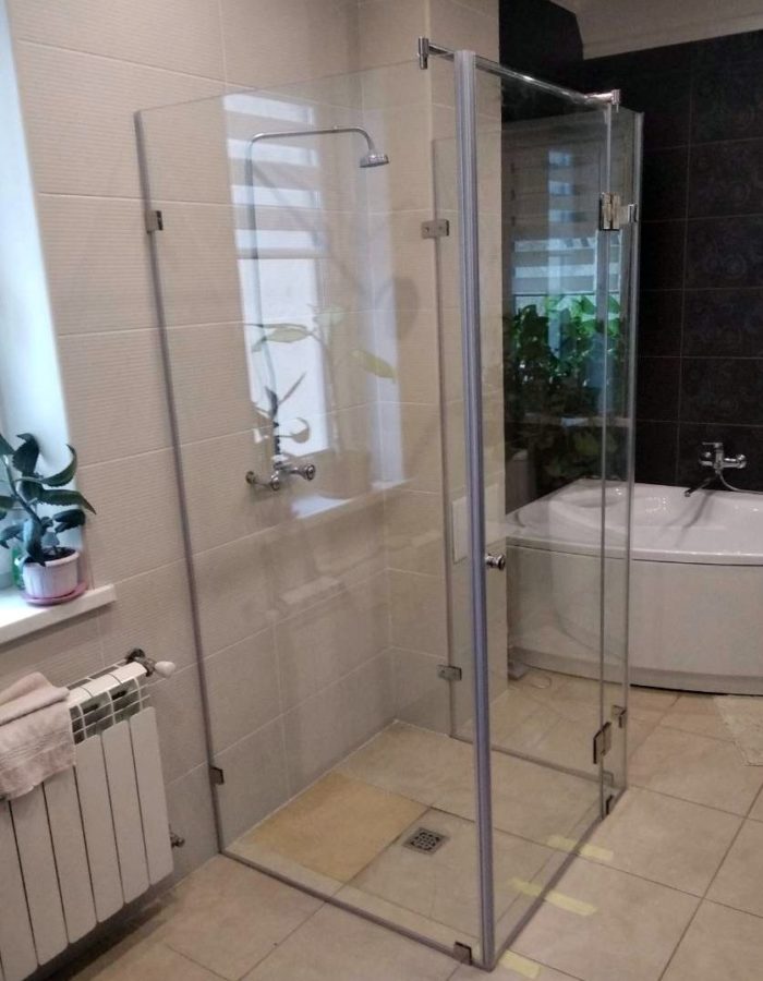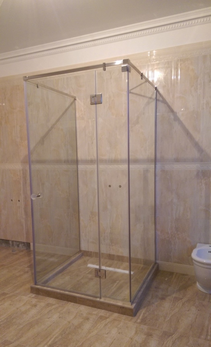 П-образная прямоугольная стеклянная душевая кабина комплектуется стильной и высококачественной фурнитурой из латуни и нержавеющей стали, которая отлично гармонирует с керамической плиткой и другими видами современной отделки. Широкий ассортимент дизайнов и цветов: хром, матовый хром, бронза, с напылением под золото, черный и пр. удовлетворит любой самый взыскательный вкус. Исполнение заказа возможно не только из обычного стекла, но и осветленного, тонированного, матового, в том числе с применением художественной пескоструйной обработки либо гравировки, по желанию Заказчика.