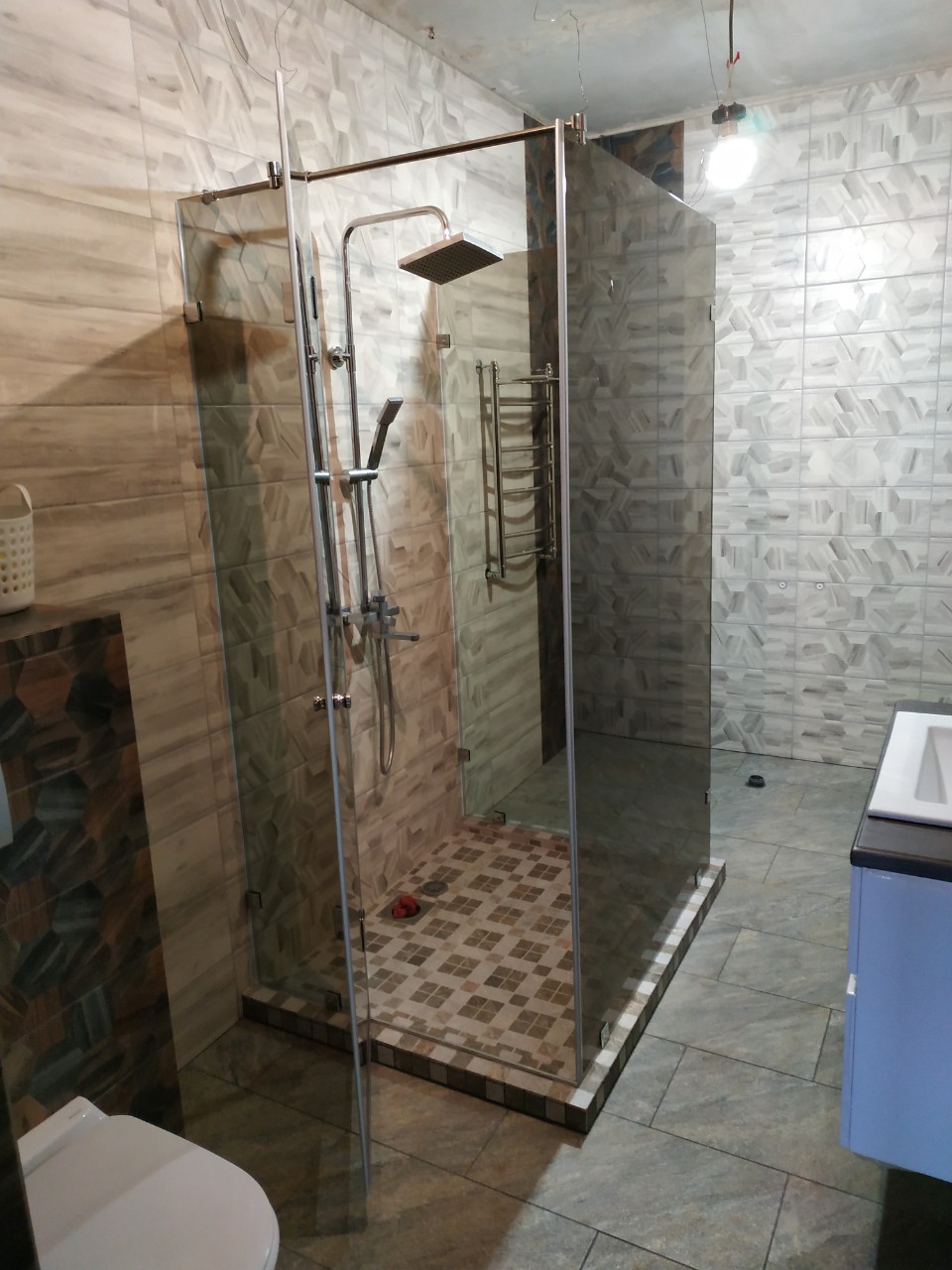 П-образная прямоугольная душевая кабина из закаленного стекла толщиной 8мм оснащается одной, как распашной, так и раздвижной стеклянной дверью по желанию Заказчика и в соответствии с пространственным потенциалом помещения. Модель душевой изготавливается под заказ по индивидуальным размерам, следовательно, идеально вписывается в интерьер ванной комнаты, площадь и конфигурация которой позволяет ее установить и подчеркивает его оригинальную стилистику.