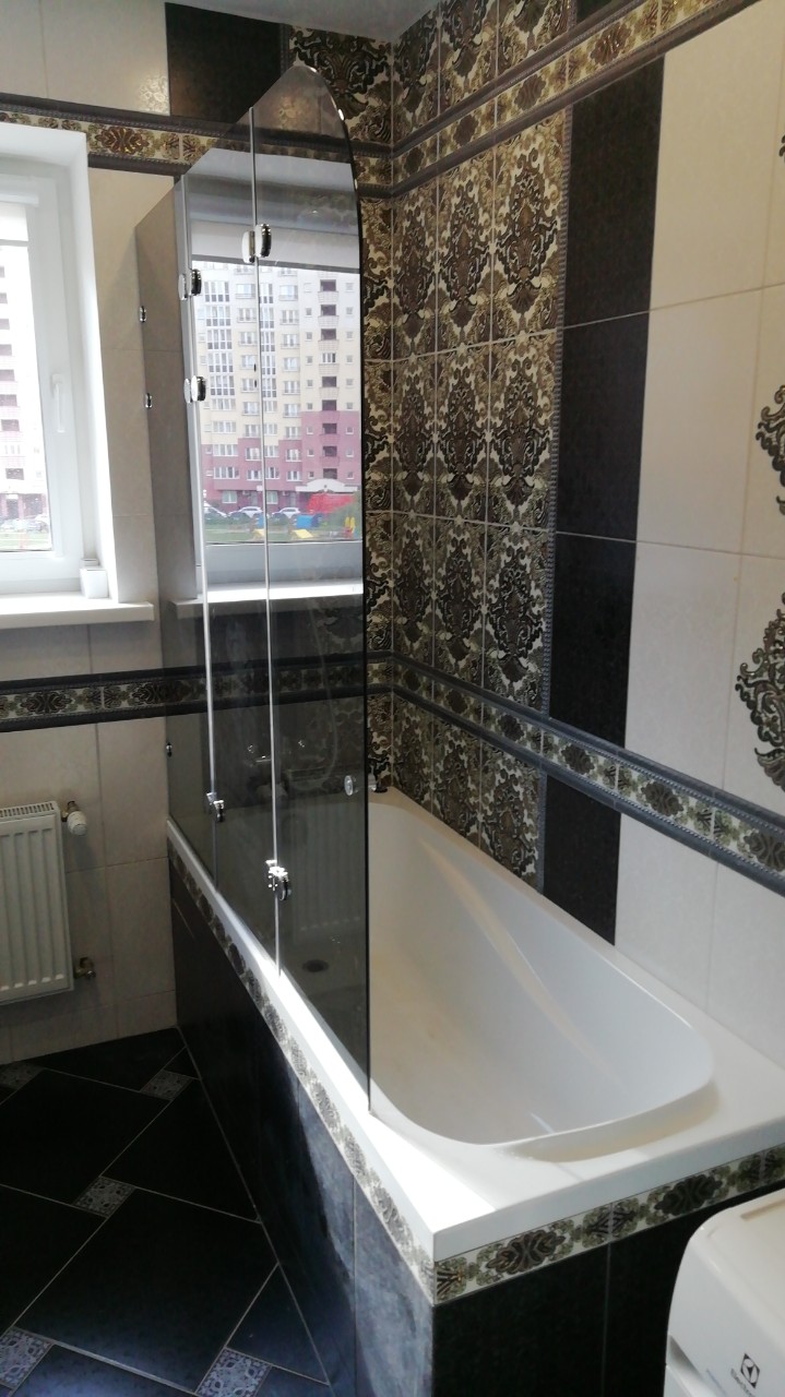 Прямая трёхстворчатая шторка-гармошка для ванной с радиусным углом из стекла