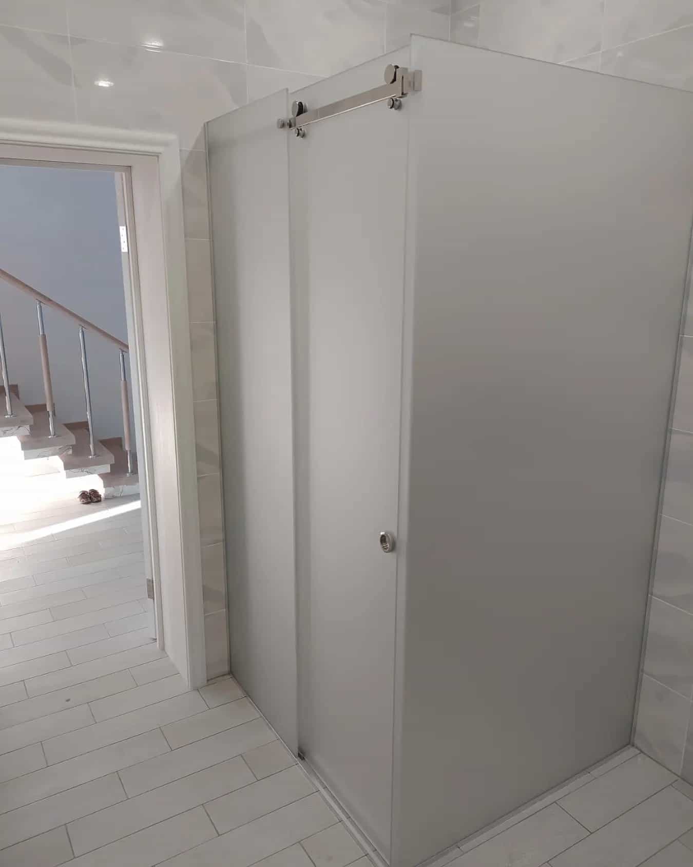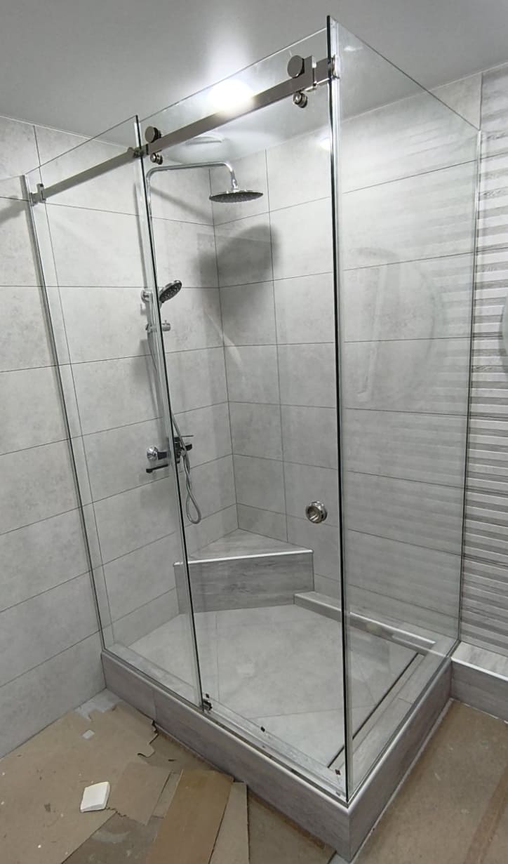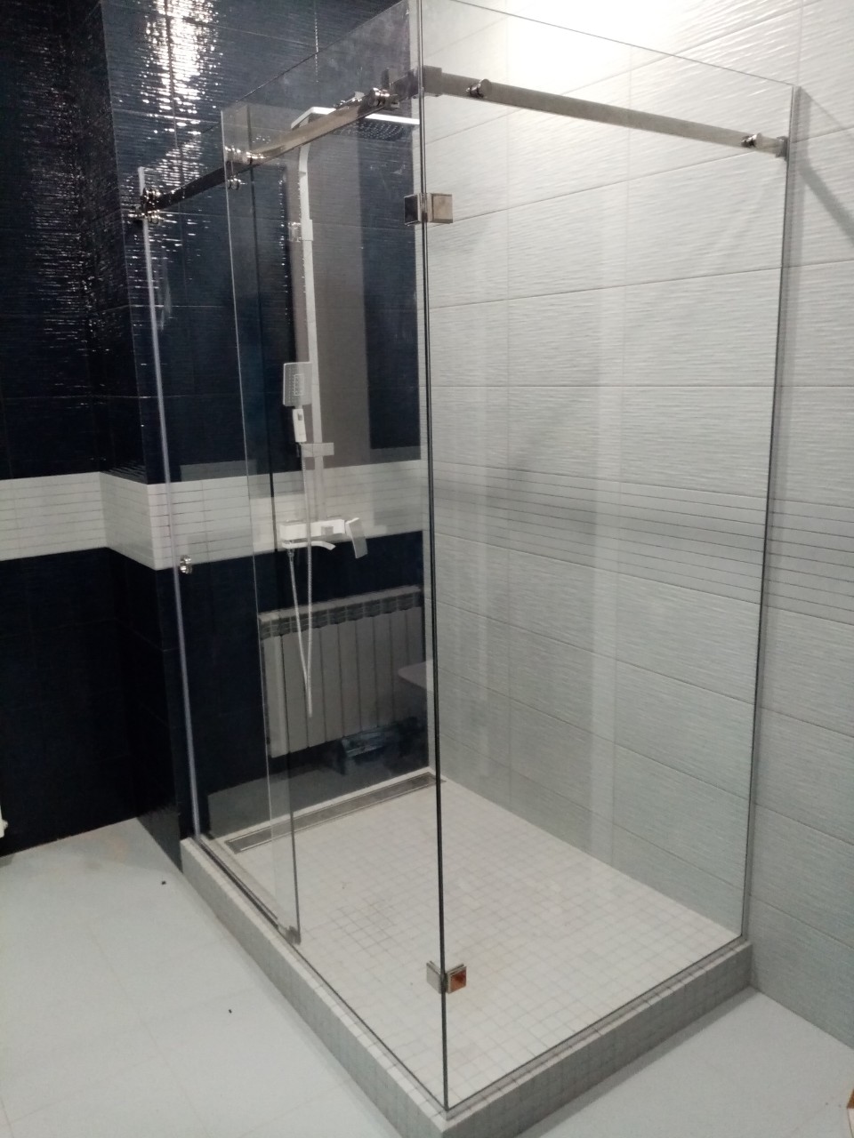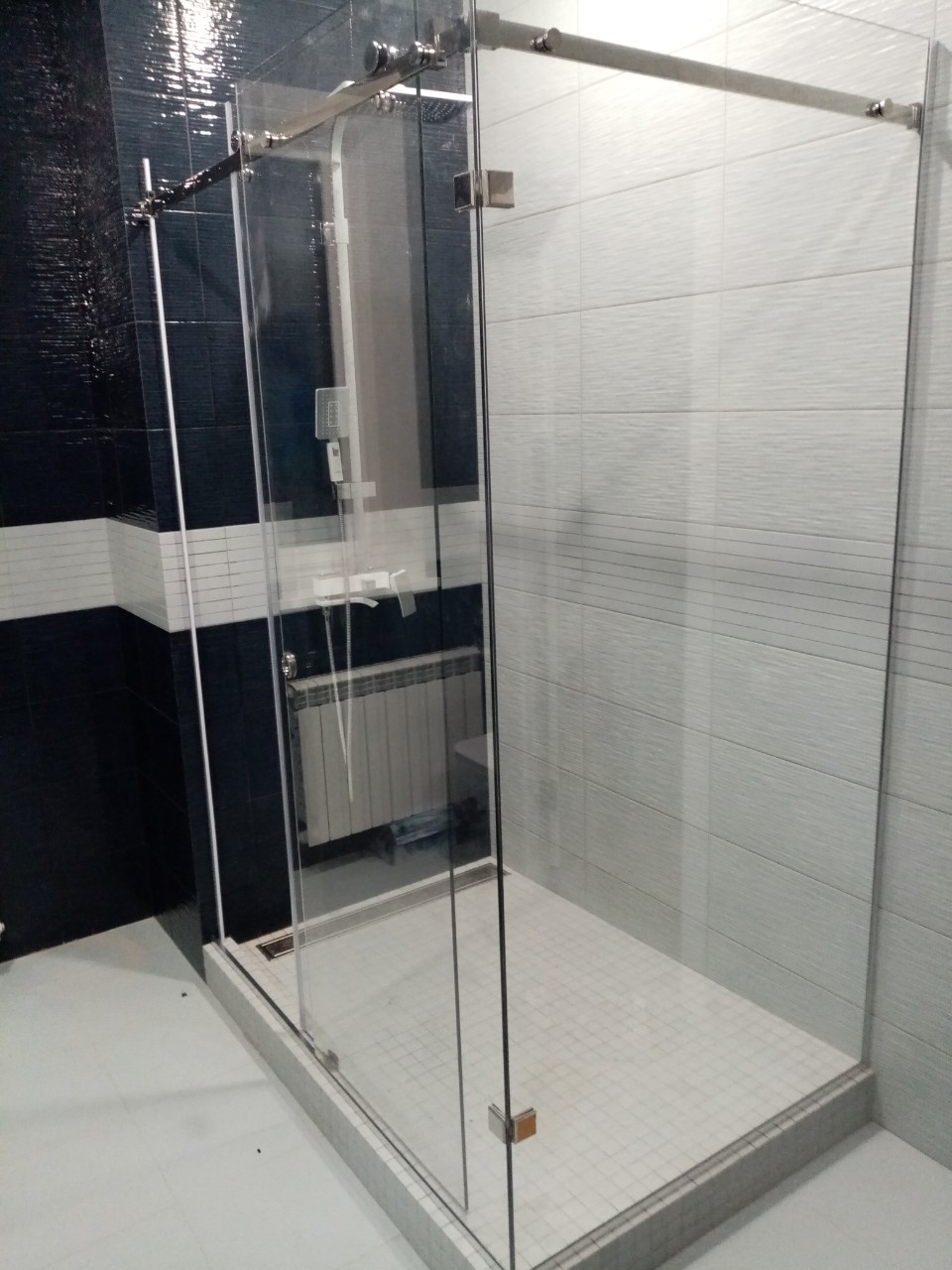 Угловая душевая кабина с добором из закаленного стекла толщиной 8мм с одной распашной или раздвижной стеклянной дверью устанавливается в предназначенном для душевой зоны углу помещения и изготавливается под заказ по индивидуальным размерам и эскизам Заказчика. Конструкция отличается вариативностью дизайнерских решений и занимает в 2-3 раза меньше места, чем стандартная ванна, что особенно важно для типовых планировок квартир с маленькими санузлами.