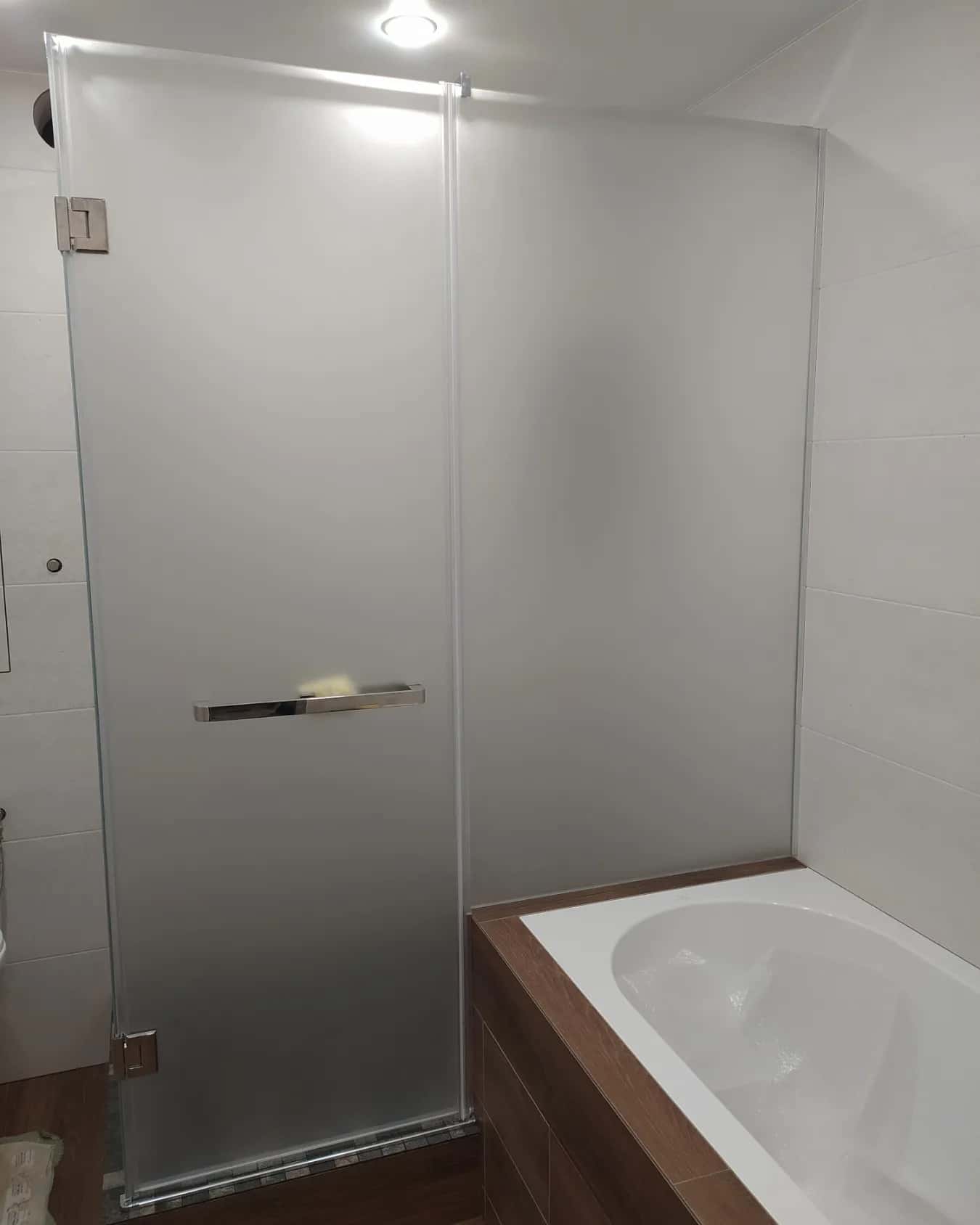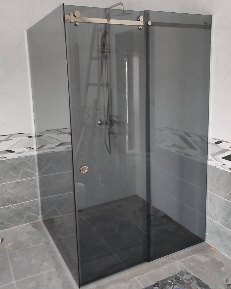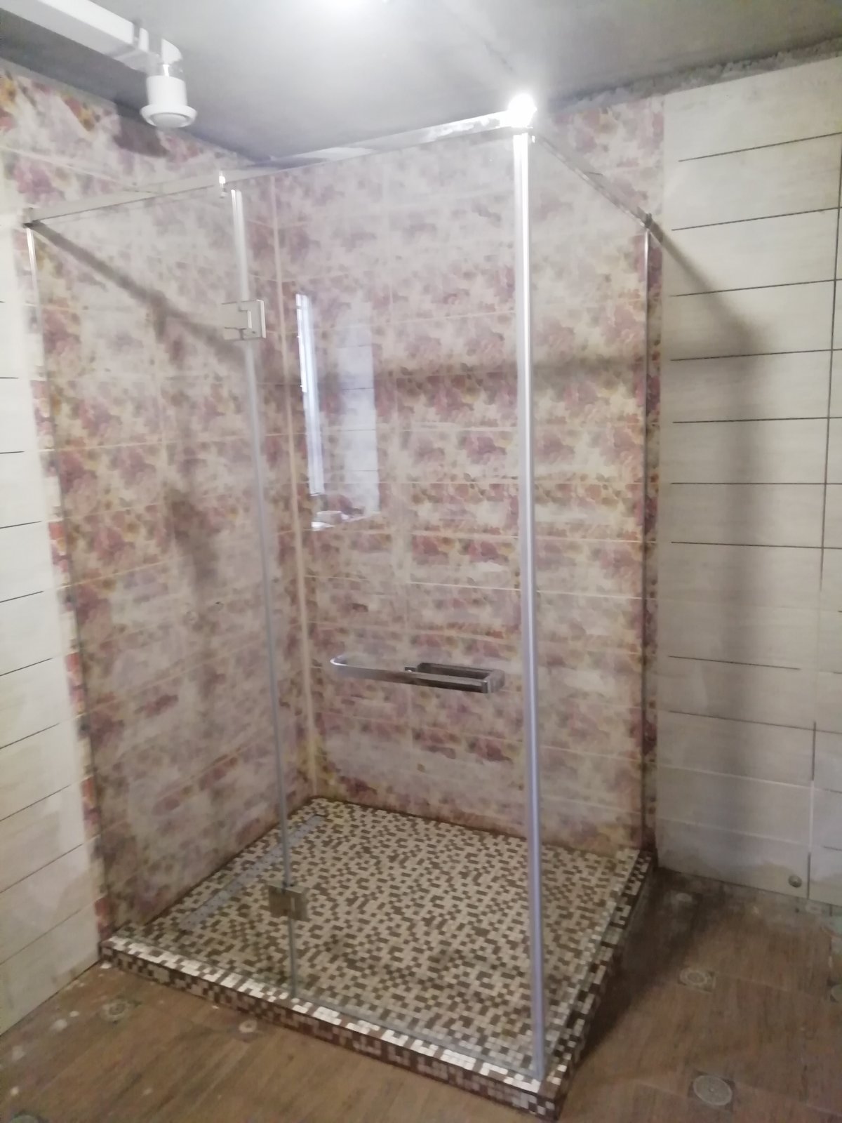 Угловая душевая кабина с добором из закаленного стекла толщиной 8мм с одной распашной или раздвижной стеклянной дверью устанавливается в предназначенном для душевой зоны углу помещения и изготавливается под заказ по индивидуальным размерам и эскизам Заказчика. Конструкция отличается вариативностью дизайнерских решений и занимает в 2-3 раза меньше места, чем стандартная ванна, что особенно важно для типовых планировок квартир с маленькими санузлами.