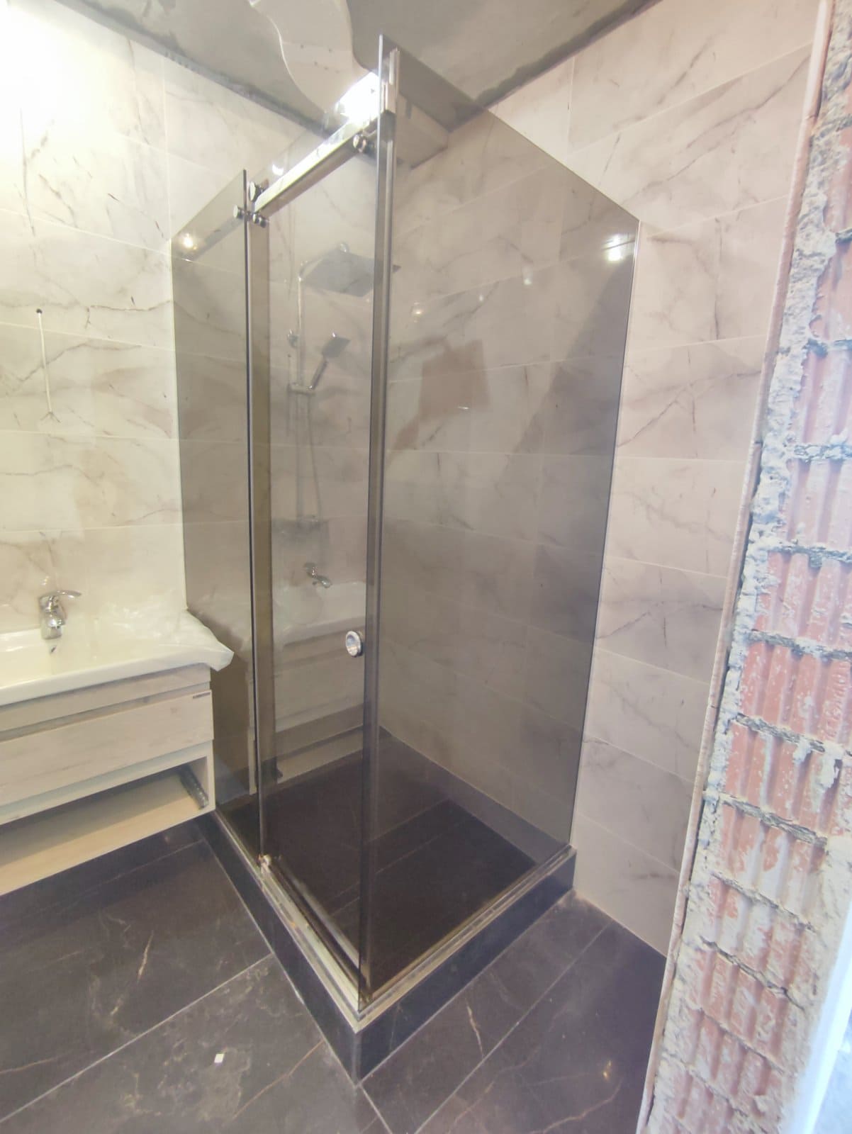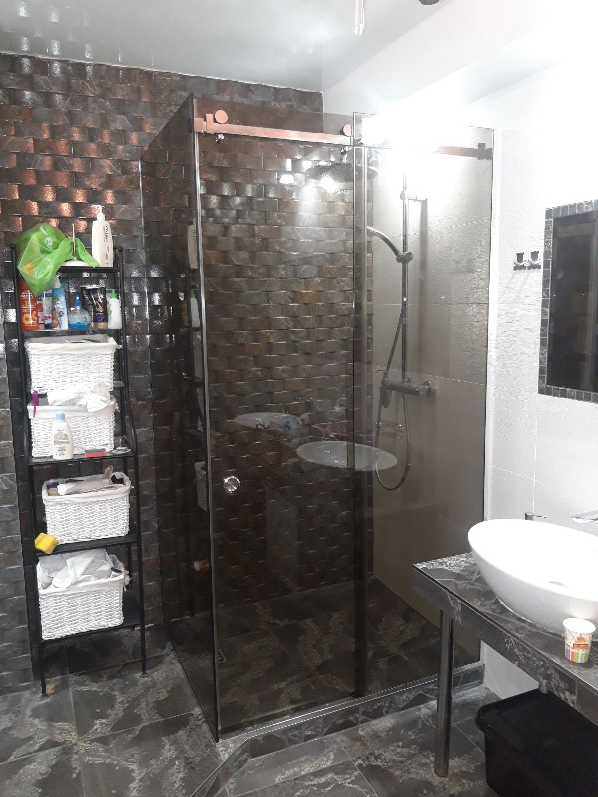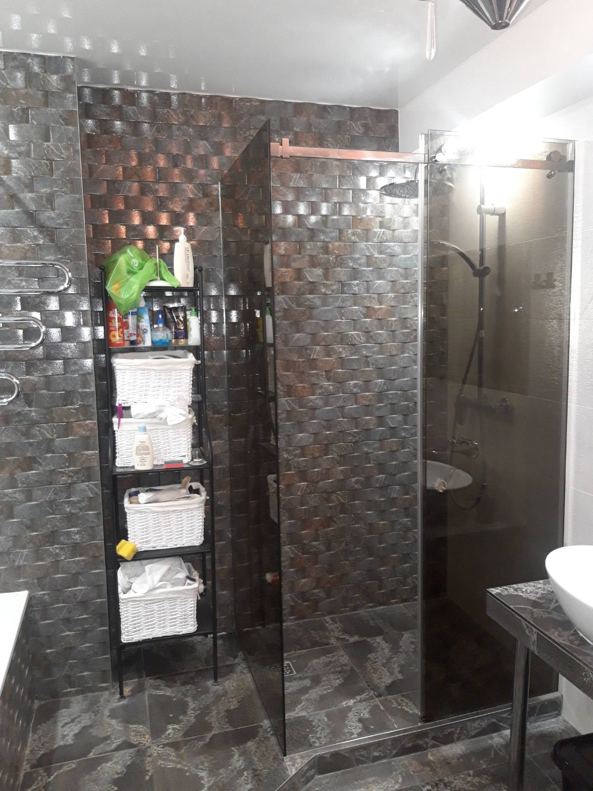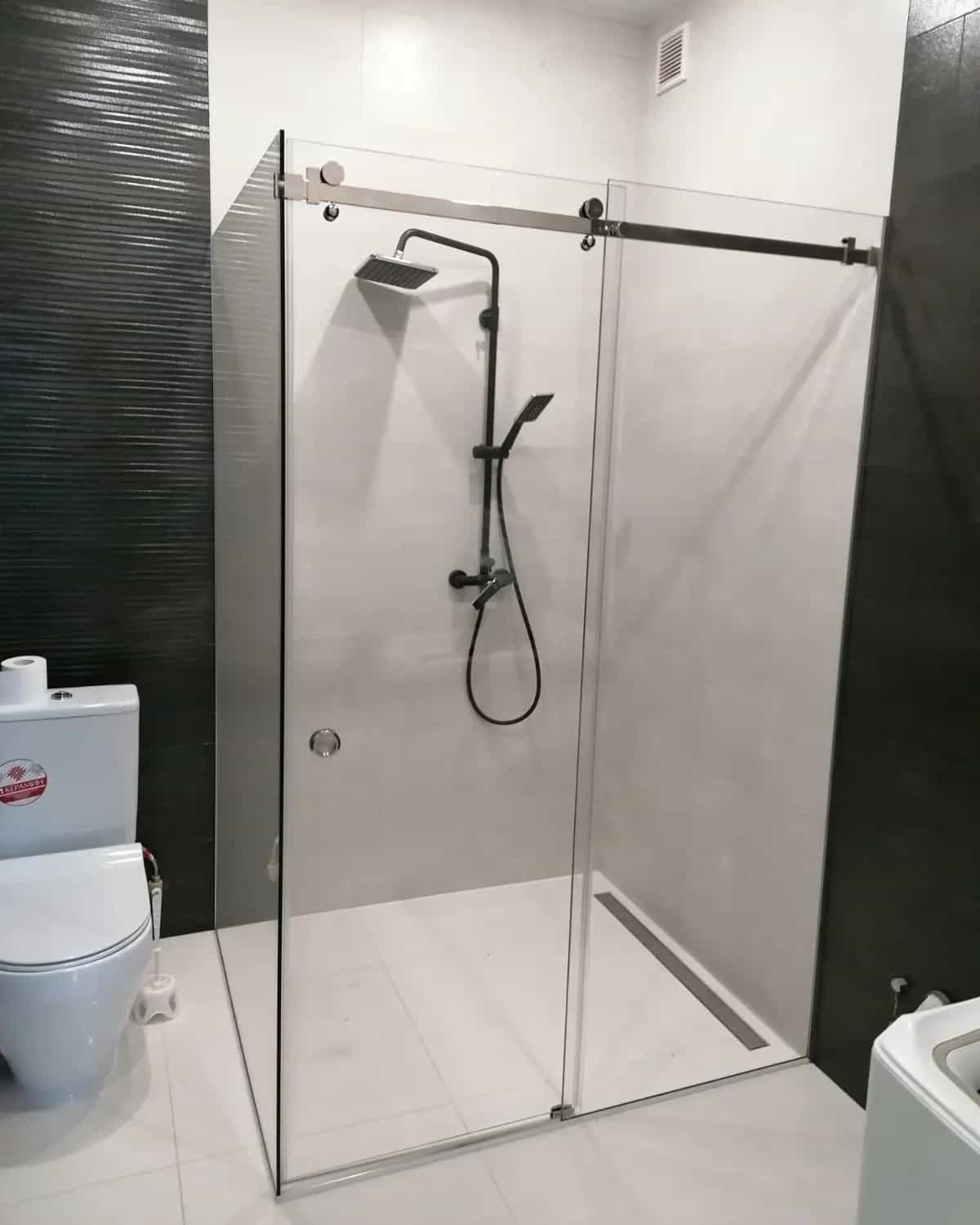 Угловая душевая кабина с добором из закаленного стекла толщиной 8мм с одной распашной или раздвижной стеклянной дверью устанавливается в предназначенном для душевой зоны углу помещения и изготавливается под заказ по индивидуальным размерам и эскизам Заказчика. Конструкция отличается вариативностью дизайнерских решений и занимает в 2-3 раза меньше места, чем стандартная ванна, что особенно важно для типовых планировок квартир с маленькими санузлами.