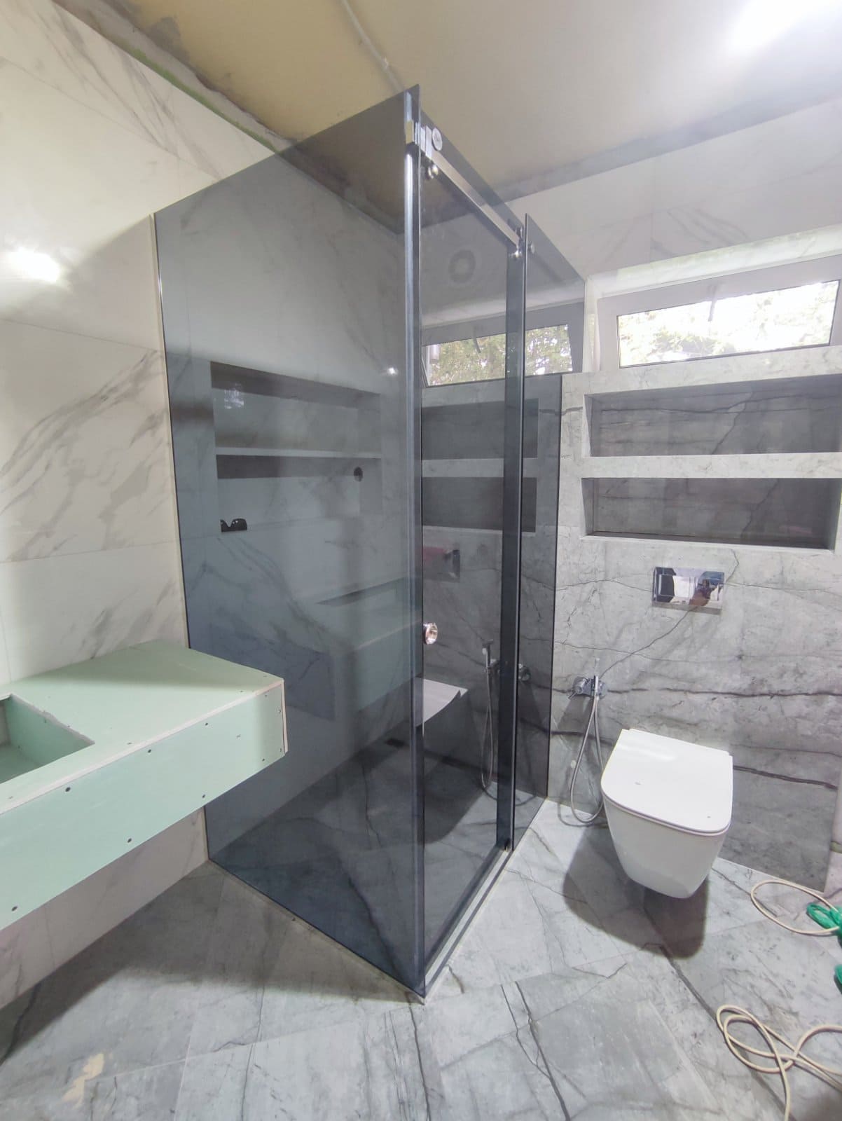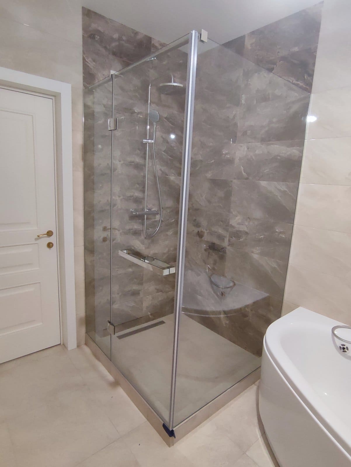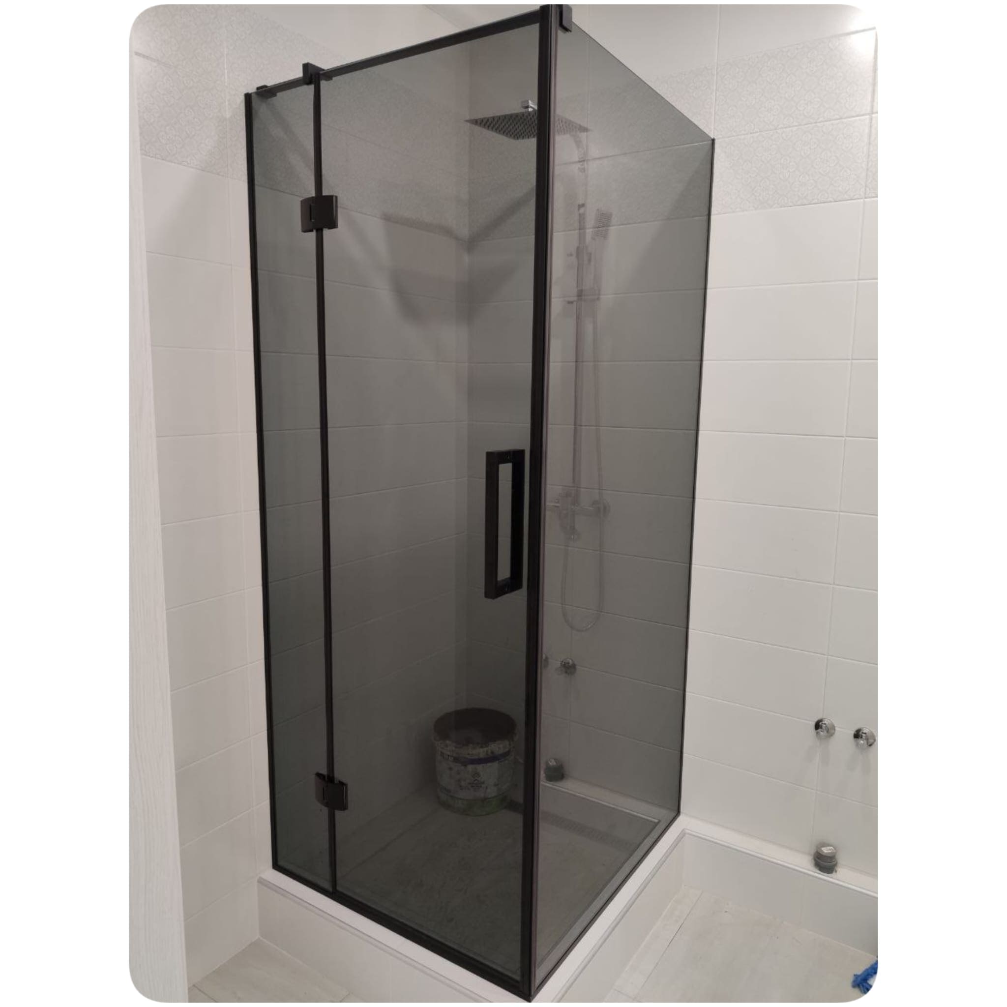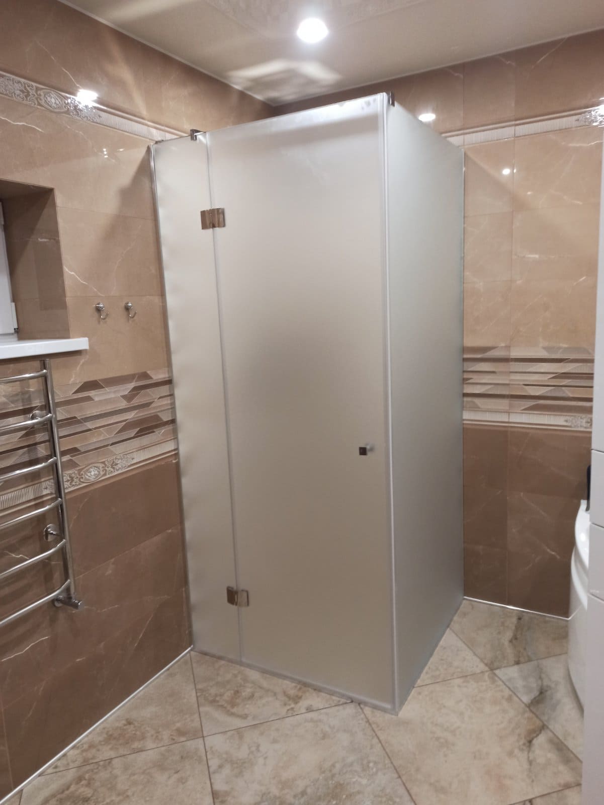 Стеклянная угловая душевая кабина с добором комплектуется стильной и высококачественной фурнитурой из латуни и нержавеющей стали, которая отлично гармонирует с керамической плиткой и другими видами современной отделки. Широкий ассортимент дизайнов и цветов: хром, матовый хром, бронза, с напылением под золото, черный и пр. удовлетворит любой самый взыскательный вкус. Исполнение заказа возможно не только из обычного стекла, но и осветленного, тонированного, матового, в том числе с применением художественной пескоструйной обработки либо гравировки, по желанию Заказчика.
